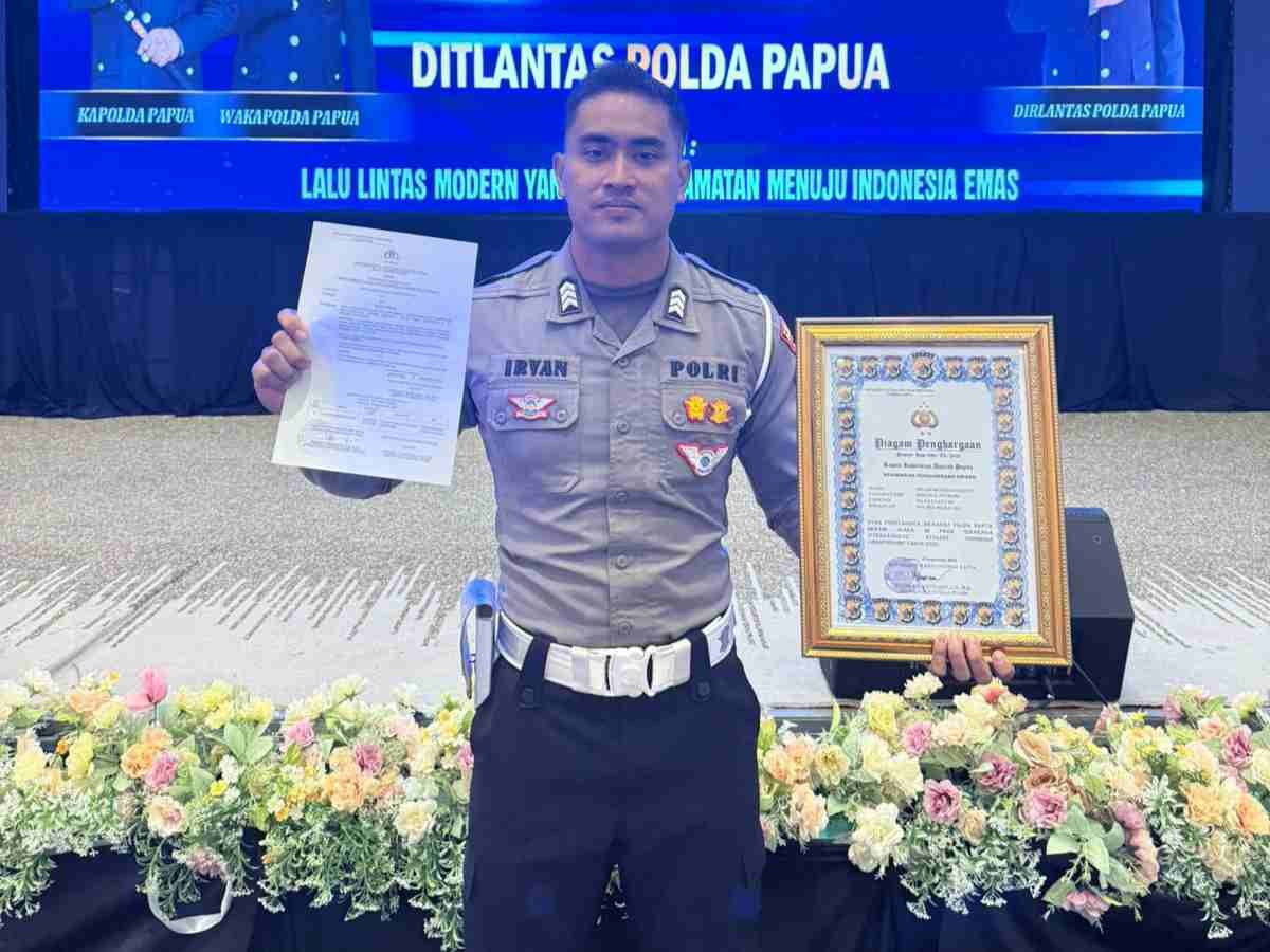 Papua – Sosok Polisi Lalu Lintas Polres Merauke, Brigpol Irvan Moernandany, berhasil mengharumkan nama institusi Polri dengan torehan prestasinya di bidang olahraga. Pada momentum Syukuran HUT Lalu Lintas ke-70 Polda Papua yang digelar di Aula Hotel Suny, Abepura, Jayapura, Brigpol Irvan menerima piagam penghargaan yang diserahkan langsung oleh Wakapolda Papua, Senin (22/09).