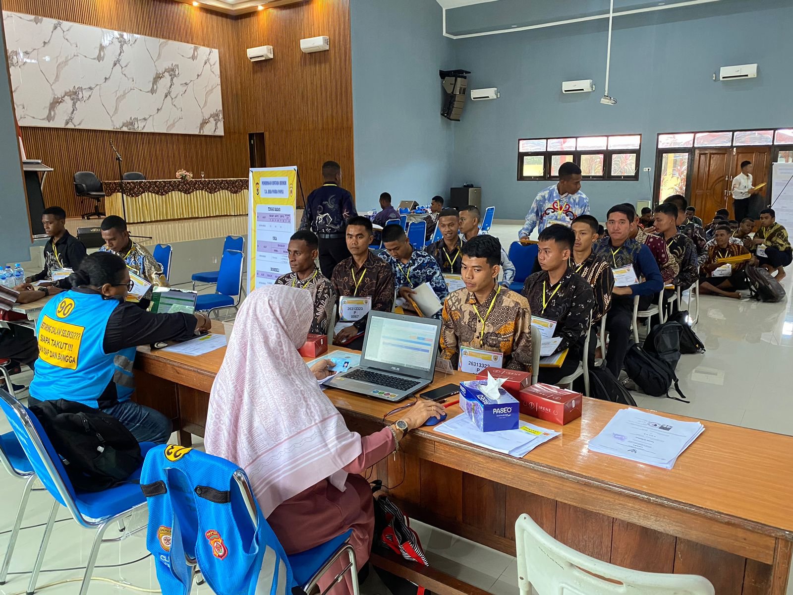 Papua – Pelaksanaan pemeriksaan administrasi (Rikmin) Penerimaan Bintara Brimob T.A. 2025 Panda Papua memasuki hari ketiga yang digelar di Aula Elsama Numberi SPN Polda Papua. Kegiatan ini berjalan dengan lancar dan penuh kedisiplinan sebagai tahap penting sebelum peserta melanjutkan ke rangkaian seleksi berikutnya, Sabtu (22/11/25).
