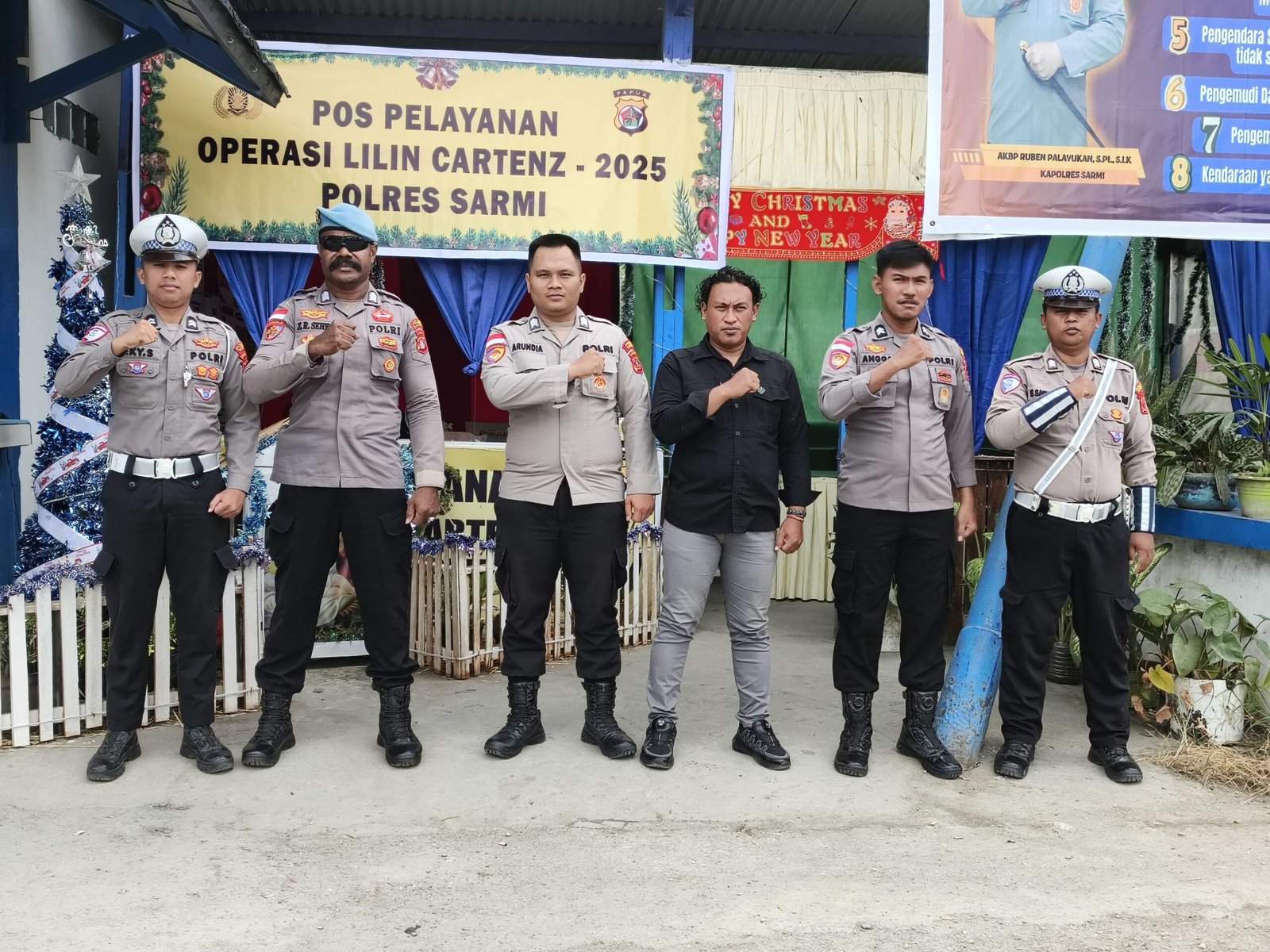 Sarmi – Guna memastikan perayaan Natal dan Tahun Baru berjalan aman, tertib, dan kondusif, Polres Sarmi menempatkan personelnya di sejumlah pos pengamanan Natal dan Tahun Baru yang telah disiapkan di wilayah Kabupaten Sarmi, dengan melibatkan unsur TNI. Selasa (23/12/25)