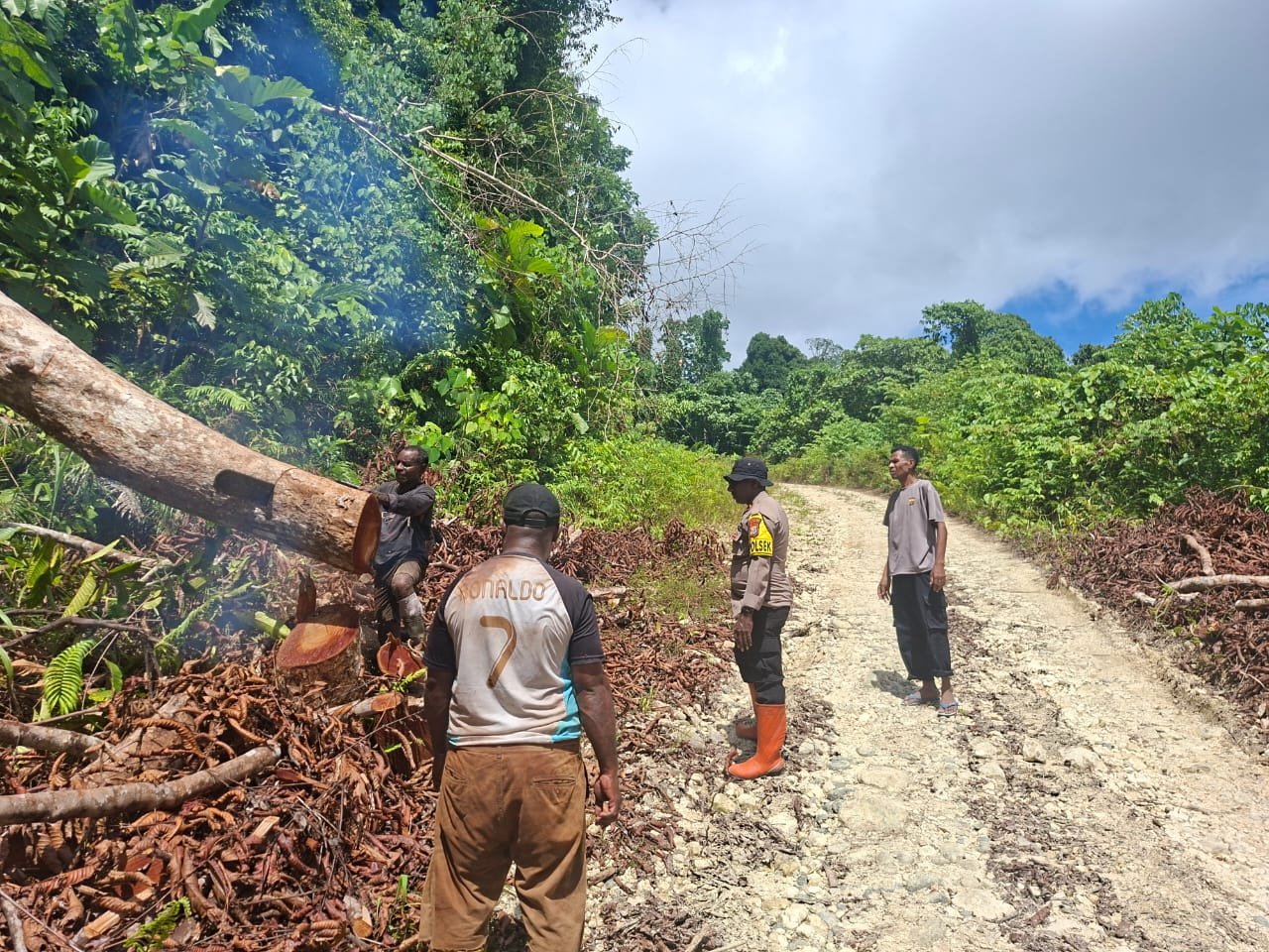 Sarmi – Sebagai bentuk respons cepat terhadap gangguan akses jalan dan wujud kepedulian terhadap keselamatan masyarakat, Kapolsek Tor Atas bersama personel dan warga setempat melaksanakan kegiatan pembersihan badan jalan yang tertutup pohon tumbang.