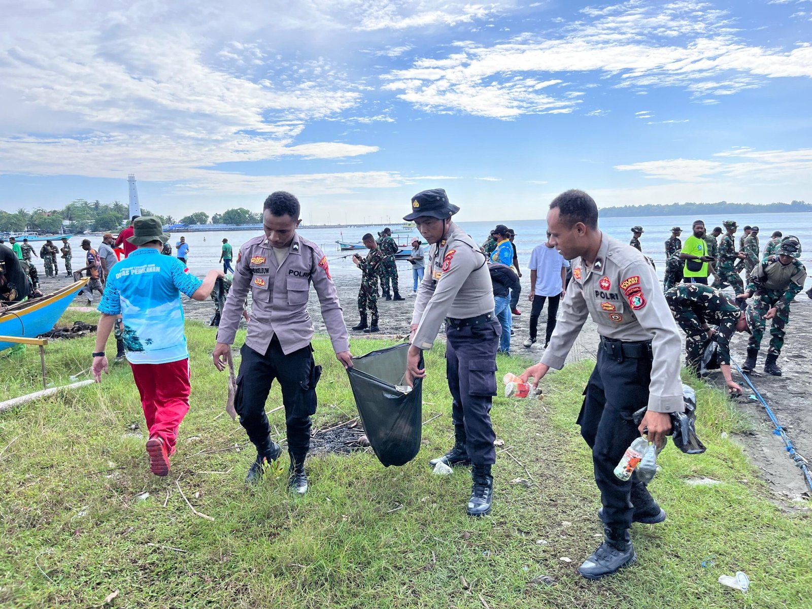 Sarmi – Dalam rangka mendukung Gerakan Nasional Indonesia Asri, personel Polres Sarmi bersama personel Polsek Sarmi Kota dan Sat Polairud Polres Sarmi mengikuti kegiatan kurvei atau gotong royong di kawasan Pantai Kali Bagre, Kota Sarmi pada Jum’at (13/2/26)