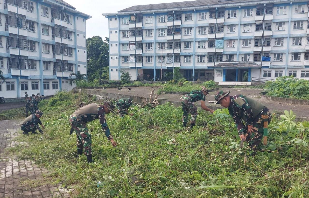 A. Personel Kodim 1310/Bitung melaksanakan pembersihan lingkungan dan revitalisasi ruang gedung Rusunawa Tangkoko di Kel Manembo-nembo Tengah Kec. Matuari Kota Bitung, untuk dijadikan Marshalling Area (MA) dalam rangka mendukung pembangunan Yon TP 916 Makawidey yang berlokasi di Kel. Makawidey Kec. Aertembaga Kota Bitung;