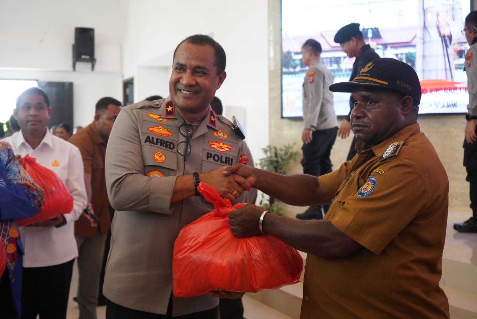 Di dampingin ketua MRP dan Bupati Teluk Bintuni, Kapolda Papua Barat berikan 350 paket sembako dan langsung diserahkan kepada penerima tali asih.