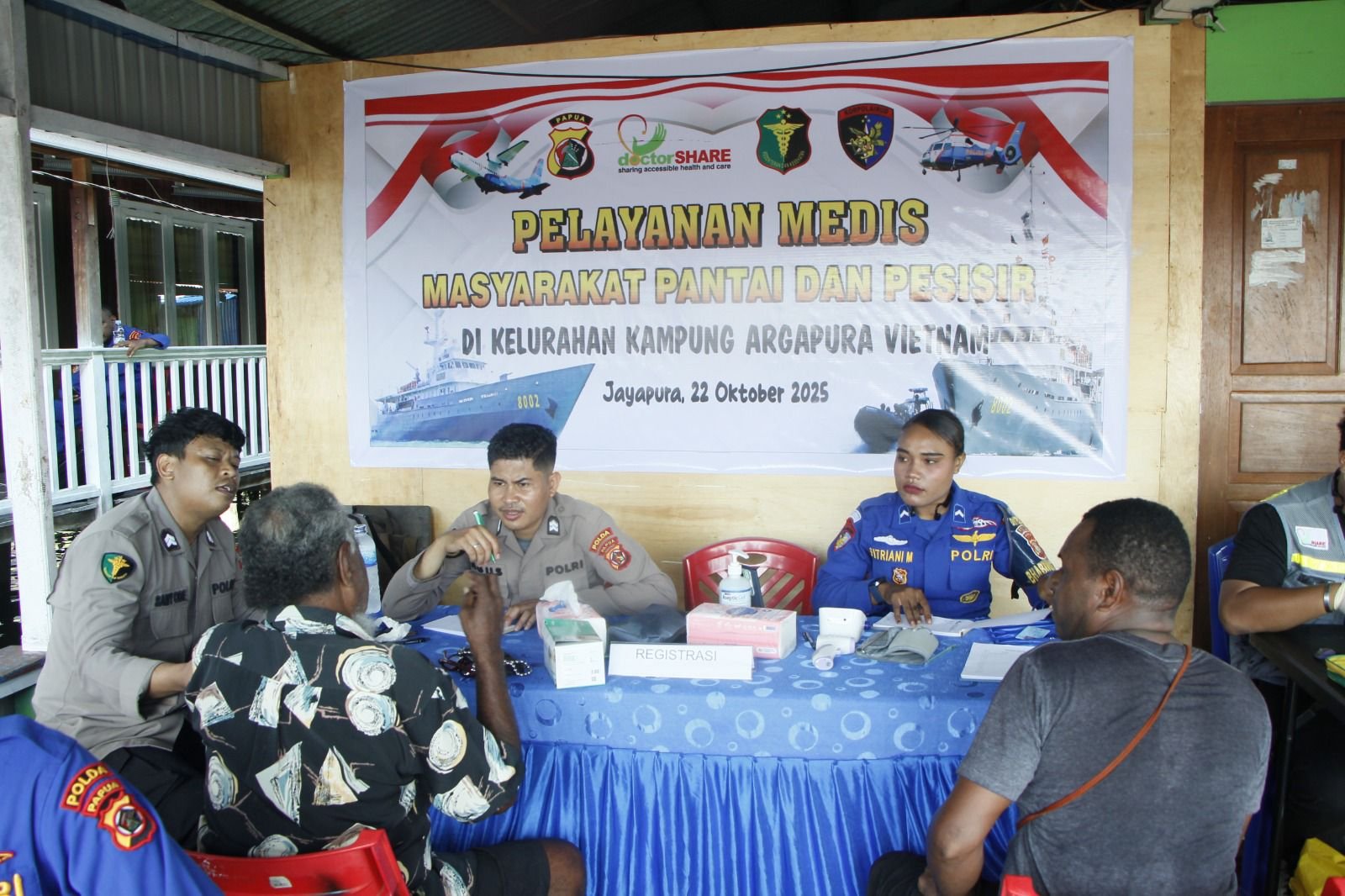 Papua – Direktorat Kepolisian Perairan dan Udara (Polairud) Polda Papua bersama Biddokkes Polda Papua dan Komunitas Dokter Share melaksanakan kegiatan pelayanan medis dan pengobatan gratis bagi masyarakat di Kampung Vietnam, Kelurahan Argapura, Kota Jayapura, pada Rabu (22/10/2025).