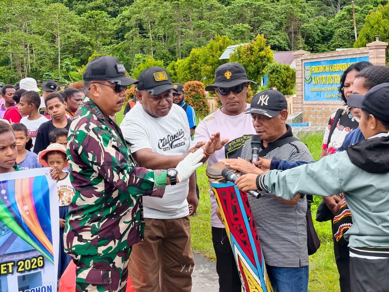 Sarmi – Kapolsek Bonggo IPTU Yustus Maudul, SE., M.Si. bersama anggota Polsek Bonggo mengikuti kegiatan jalan santai, pembersihan atau pemungutan sampah plastik serta penanaman pohon yang dilaksanakan di Kampung Kiren dan Kampung Narum, Distrik Bonggo Timur, Jumat (13/3/2026).