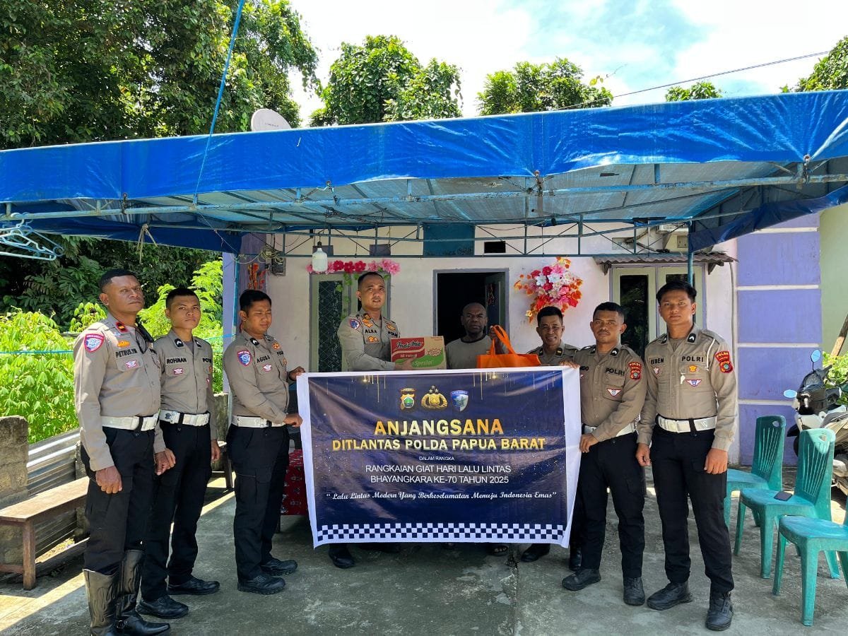 Dalam kegiatan tersebut, rombongan Ditlantas Polda Papua Barat dipimpin oleh sejumlah perwira dan personel, sekaligus menyerahkan bantuan berupa paket sembako sebagai wujud kepedulian dan solidaritas keluarga besar Polri.