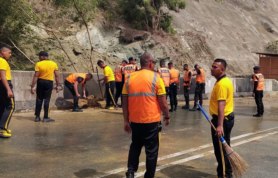 Personel Dit Samapta dikerahkan dengan dukungan personel Brimob serta Kendaraan Armoured Water Cannon (AWC) Dit Samapta dan Brimob. Para petugas bahu-membahu menyingkirkan sisa-sisa tanah dan bebatuan yang terbawa longsor akibat curah hujan tinggi beberapa waktu lalu yang berpotensi mengganggu kelancaran arus lalu lintas.