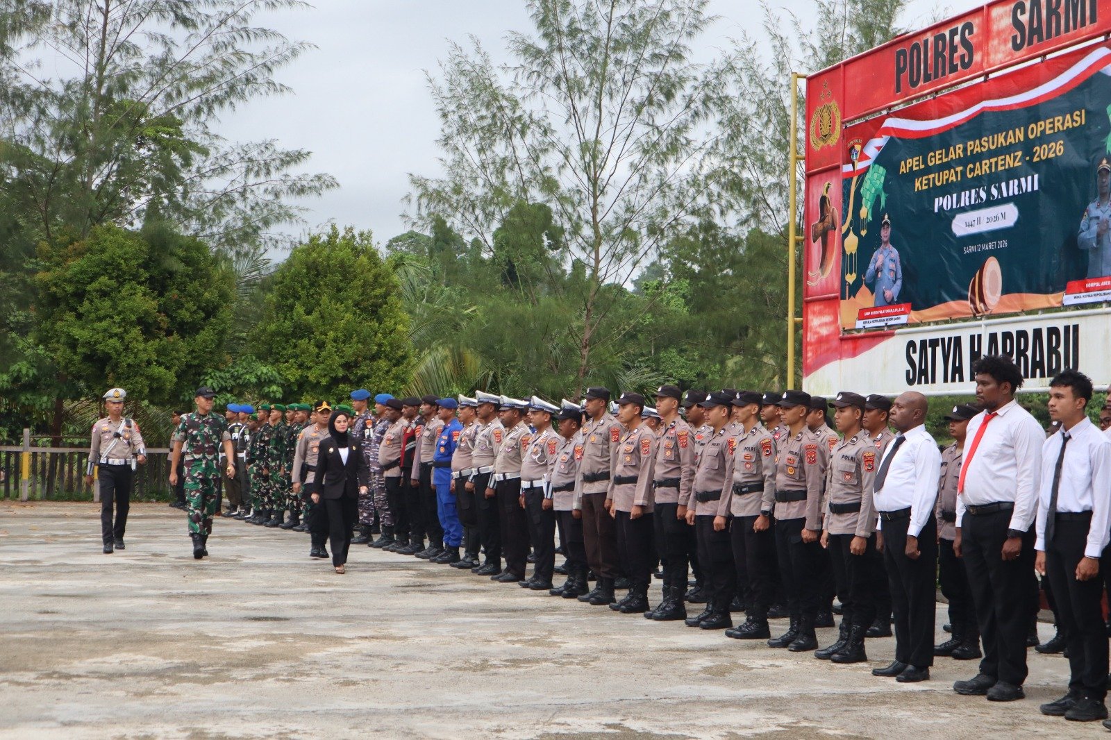 Sarmi – Polres Sarmi melaksanakan Apel Gelar Pasukan Operasi Ketupat Cartenz 2026 pada Kamis (12/3/26) sore sebagai bentuk kesiapan dalam rangka pengamanan Hari Raya Idul Fitri 1447 H di wilayah Kabupaten Sarmi.