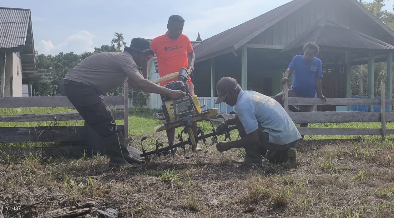 Sarmi – Polsek Bonggo jajaran Polres Sarmi (Polda Papua) bersama Kelompok Karang Taruna Kampung Mawesday Distrik Bonggo Timur melaksanakan kegiatan pengolahan lahan ketahanan pangan yang terletak di belakang Kantor Balai Kampung Mawesday. Lahan seluas 75 x 50 meter atau 3.750 m² tersebut dipersiapkan untuk ditanami kacang tanah. Sabtu (20/9/25)
