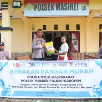Papua – Dalam rangka mendukung ketahanan pangan dan menjaga stabilitas harga bahan pokok di wilayah hukumnya, Polsek Masirei menggelar Gerakan Pangan Murah Beras SPHP Sinergitas Polres Waropen dan Bulog Cabang Serui, bertempat di Mapolsek Masirei dan dilanjutkan di Perempatan Jalan Trans Masirei, Jumat (12/09/2025).