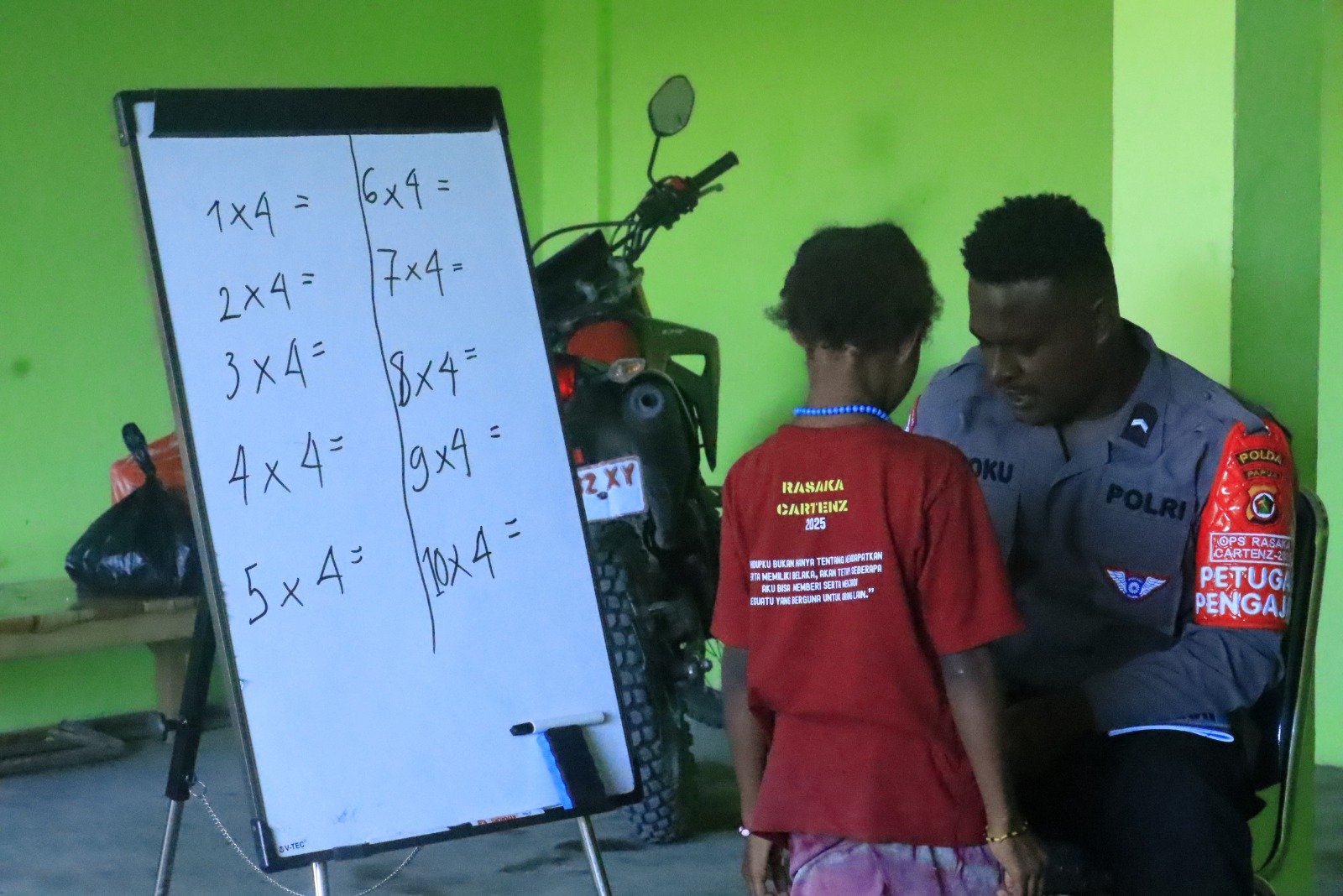 Dengan penuh semangat, personel Subsatgas mengajarkan dasar-dasar perkalian melalui metode sederhana dan permainan edukatif agar anak-anak mudah memahami.