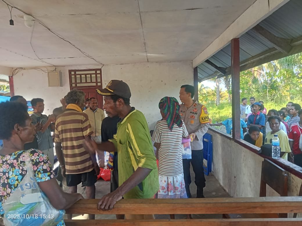 Papua – Kepedulian terhadap warga terdampak gempa bumi yang mengguncang Kabupaten Sarmi pada 16 Oktober 2025 terus mengalir. Hari ini, Kapolsek Pantai Timur Ipda T. Prasetyo Adji, S.Sos, bersama jajaran, mendampingi Pemerintah Daerah Kabupaten Sarmi dan Badan Penanggulangan Bencana Daerah (BPBD) dalam kegiatan penyaluran bantuan sembako dan perlengkapan kebutuhan dasar bagi masyarakat terdampak di Kampung Artibe dan Kampung Dabe I, Distrik Pantai Timur Barat, Sabtu (18/10).